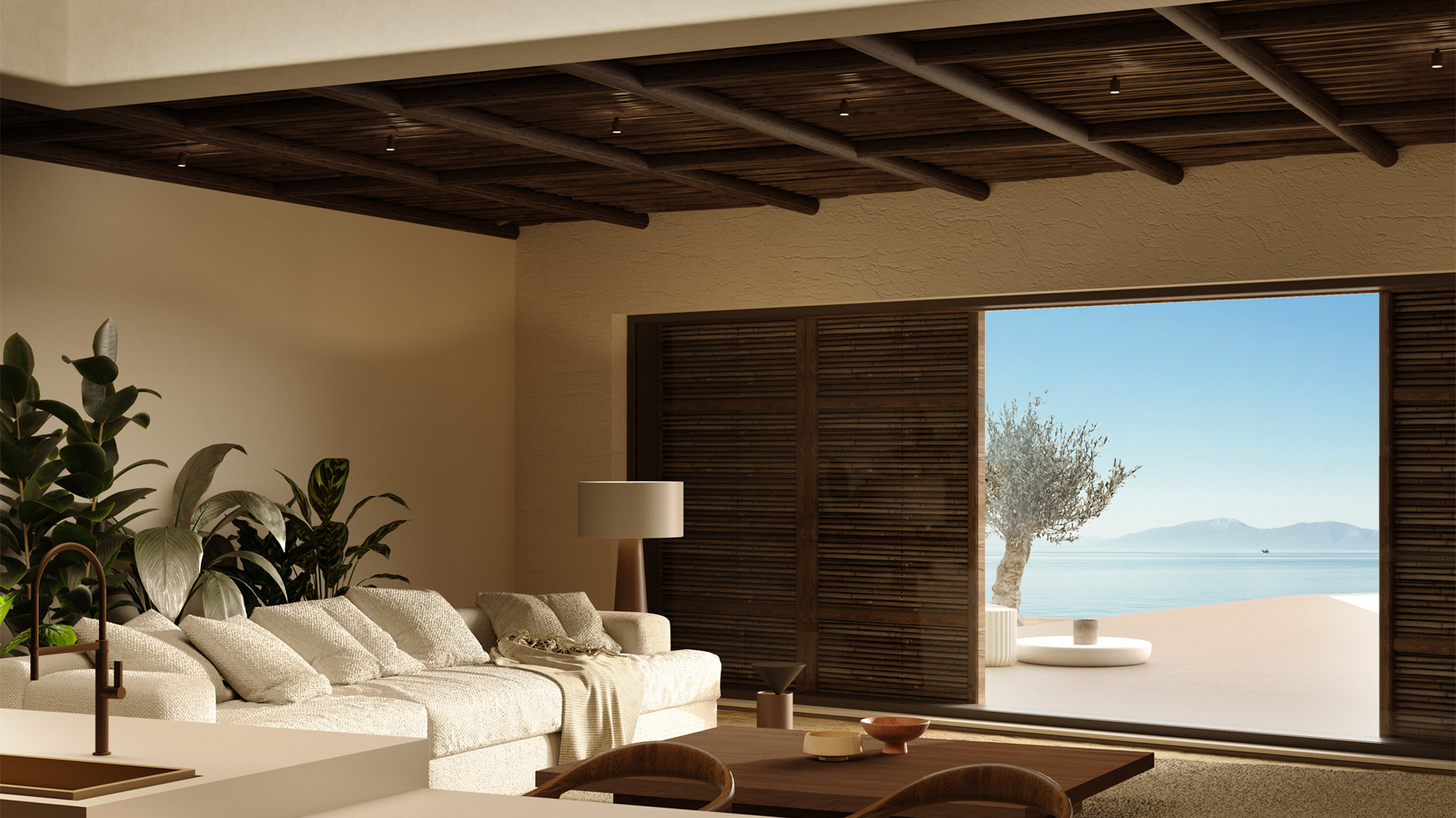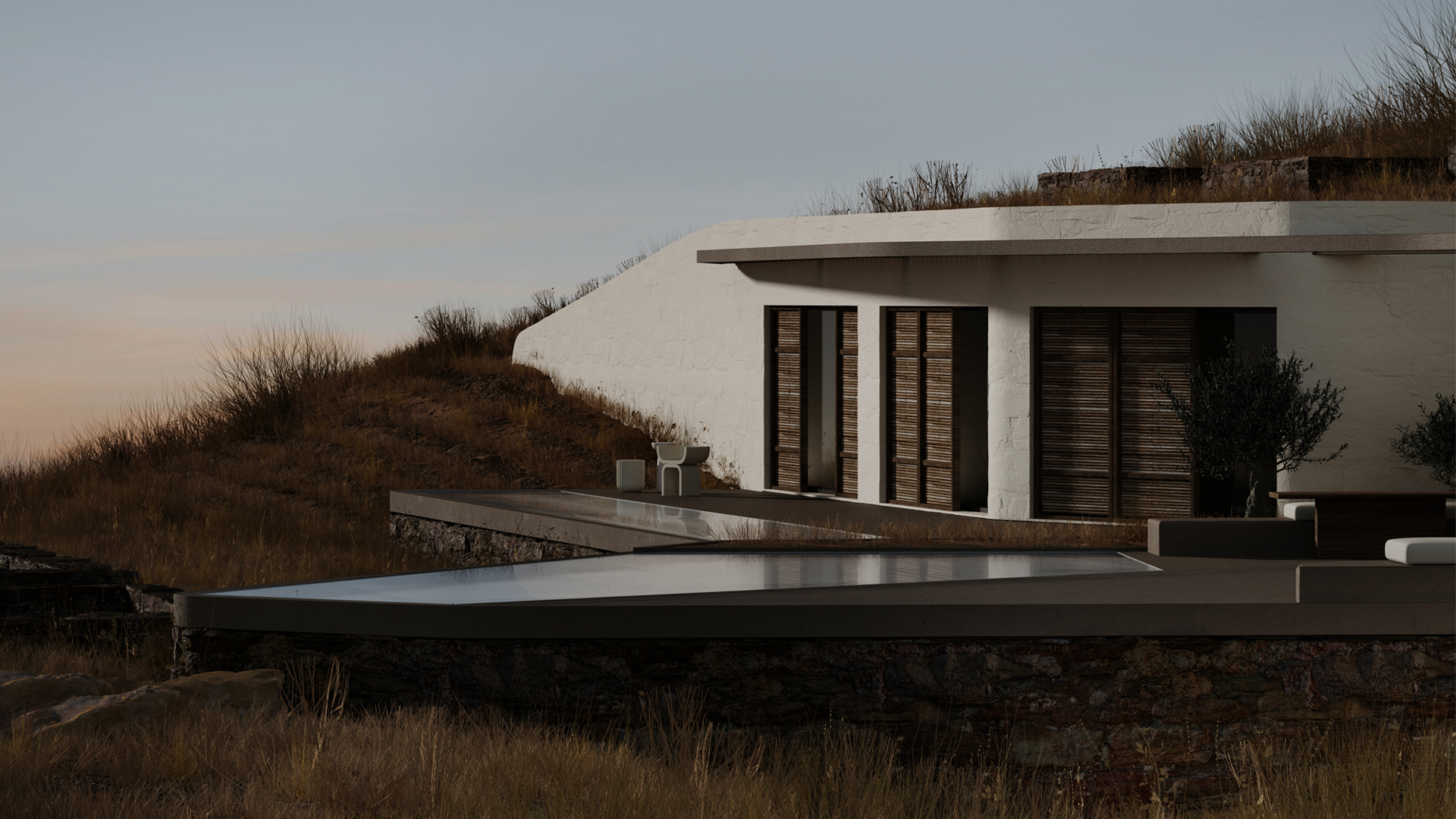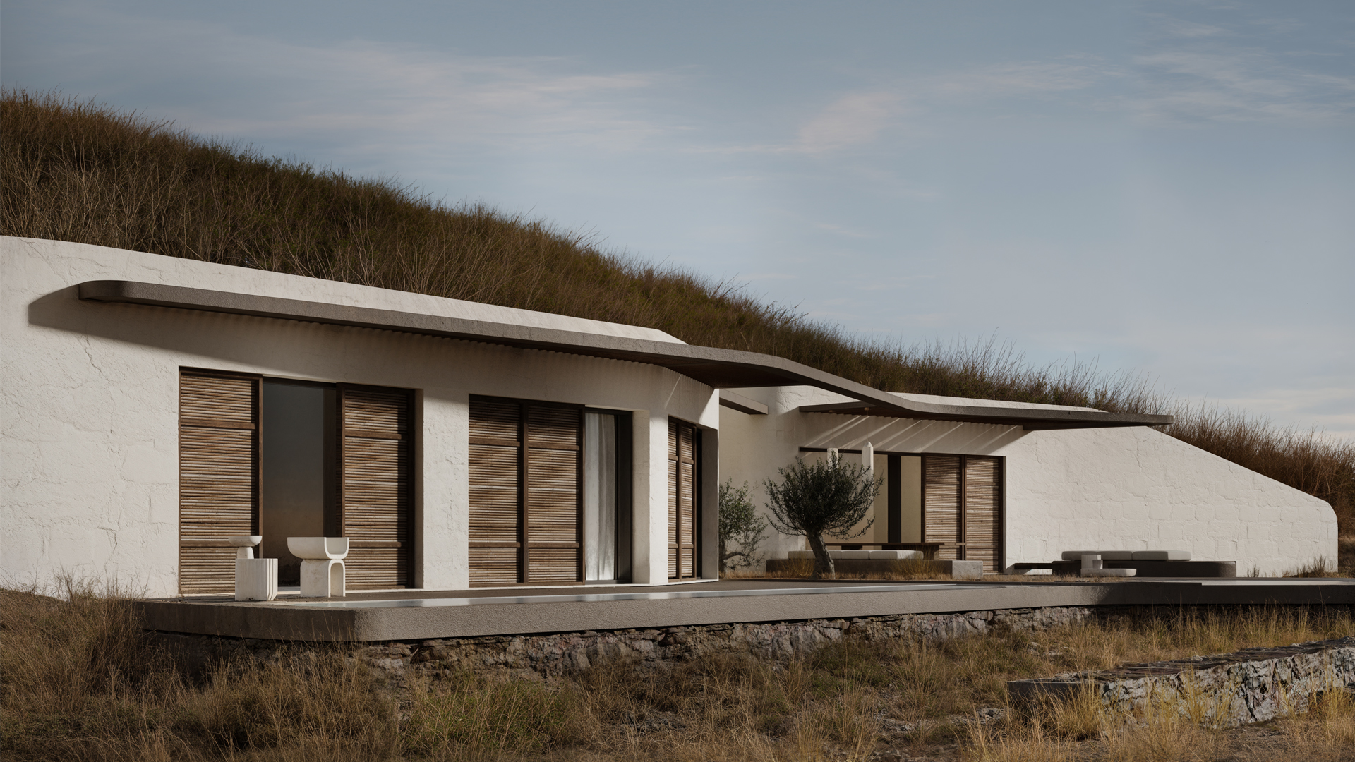 In the context of the architectural proposal, our team set as fundamental goals of the creative and design process the total harmonization and integration of the houses in the natural environment of the island, in combination with the creation of spaces that show absolute flexibility. This is why we opted for a free layout of the living areas and the free placement in the center of central elements of the interior configuration, such as the kitchen island, the living room sofa, or the beds.
