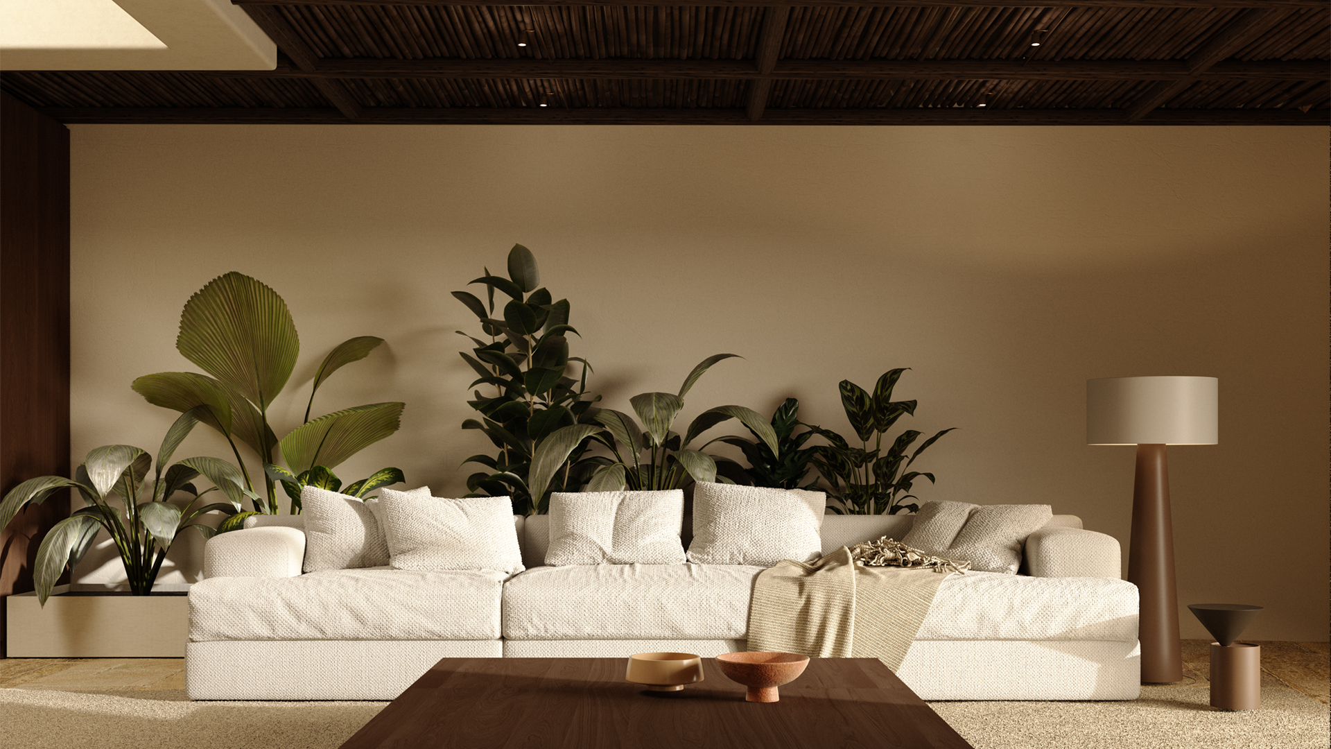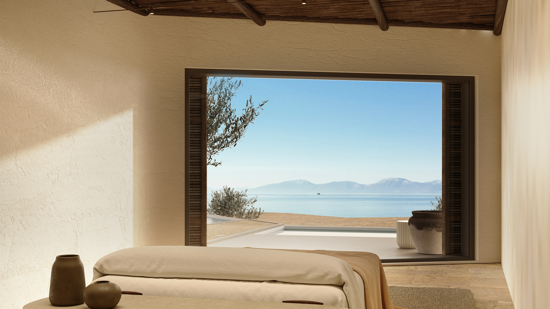 As we saw earlier, the style of the building draws elements and harmonizes perfectly with its natural landscape through the palette of materials chosen. In particular, the materials we proposed are dark wood, natural stone on the internal and external floors as well as structural elements of the external configuration of the surrounding area, matte bronze metal elements, and, of course, the cement mortar and the rough white plaster, which is a trademark of Cycladic architecture. Designed to challenge the visitor to a continuous dialogue with nature and the external environment, cave dwellings seek to create a rich and highly engaging experience for users.